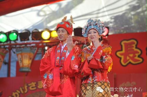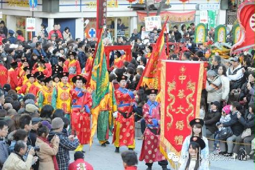 在长崎,渗透着浓郁中国韵味的婚嫁礼俗并没有完全成为过去,就在去年(2013)的长崎春节灯会期间,长崎举行了两场场面华丽恢宏的“中华大婚礼”。新郎新娘身着中国传统大红婚礼袍装,坐着轿子,嫁妆、锣鼓、鞭炮……,浩浩荡荡的迎亲队伍虽然没有“十里”之长,但也蜿蜒数百米,好不壮观,好不风光。数万人群追逐观看,好不热闹,好不喜庆!其情其景,恍如置身中国某欢快秀丽的江南小镇。
