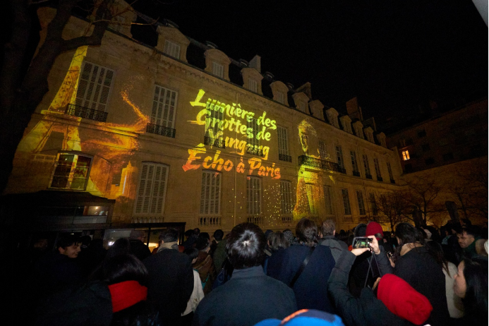 2月14日,光雕秀作为巴黎中国文化中心“走进中心过大年”系列活动的核心环节,完成内部首映并获得高度赞誉。除夕夜,活动正式面向公众开放,首场三场放映预约全满,由原定7场紧急增至20场,累计吸引观众超过4500人次。现场观众无不沉浸于云冈石窟千年艺术光影叙事,赞叹于跨越千年的东西方文明对话。