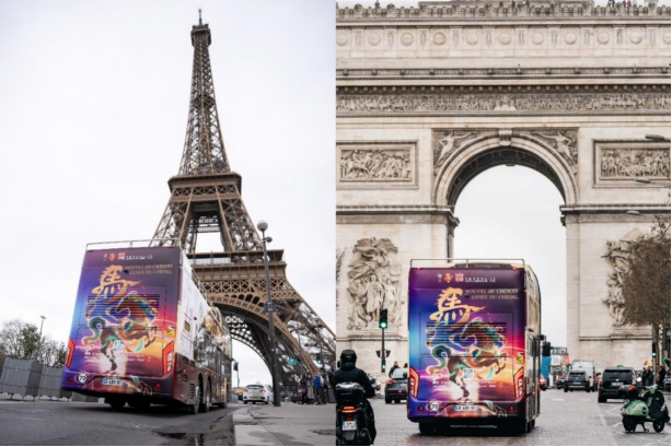 春节期间,“探弥·云冈:云冈石窟之光·巴黎回响”建筑立面光影秀成为巴黎塞纳河畔标志性景观,吸引大量市民驻足观赏。项目视觉元素深度融入“欢乐春节”宣传体系,云冈石窟品牌标识随春节主题观光巴士亮相巴黎街头,形成精准触达、广泛感知的传播效应。