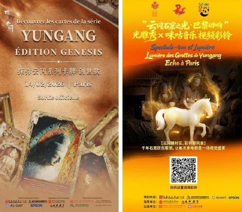 2026年2月16日至25日,时值丙午新春佳节,由中国文物交流中心与云冈研究院共同指导、巴黎中国文化中心主办、国文煊(北京)文化发展有限公司策划执行的“探弥·云冈:云冈石窟之光·巴黎回响”光雕秀,在法国巴黎掀起了一场视觉文化科技盛宴。这场数字与艺术展演,化作一扇通往东方文明的光影之窗,在声光交织之间,重现千年石窟的雕刻之美,与古老建筑的肌理相互映照,奏响了跨越时空的文明回响。