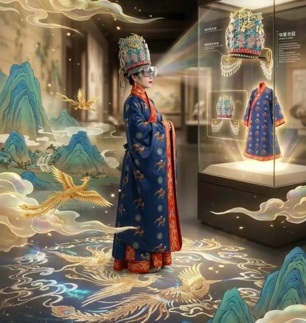为提升观展体验,展览创新融合科技互动与文化沉浸:AI数字换装系统可让观众瞬间“身着”古服留影,MR设备更支持手势交互,实现凤冠霞帔的360°全息鉴赏与细节拆解,让观众通过科技性互动体验感受古人的礼仪文化和传统服饰之美。